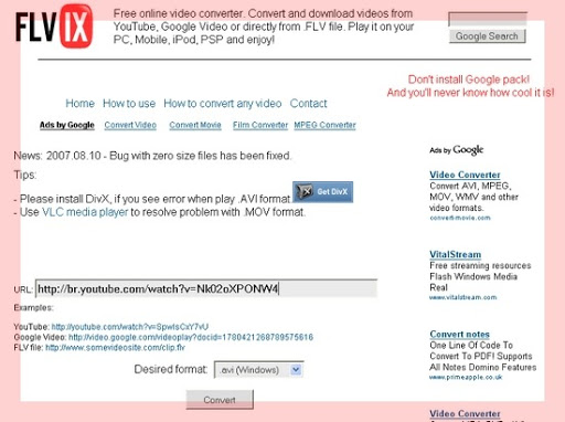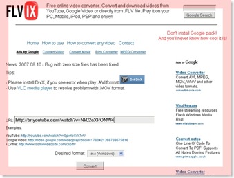 Trata-se do sítio FLV IX, no qual, através da colagem do url correspondente ao vídeo, é possível efectuar o download e simultaneamente converter o mesmo com opção para diversos formatos, a saber: AVI, MOV, 3GP, MP4, MP3.