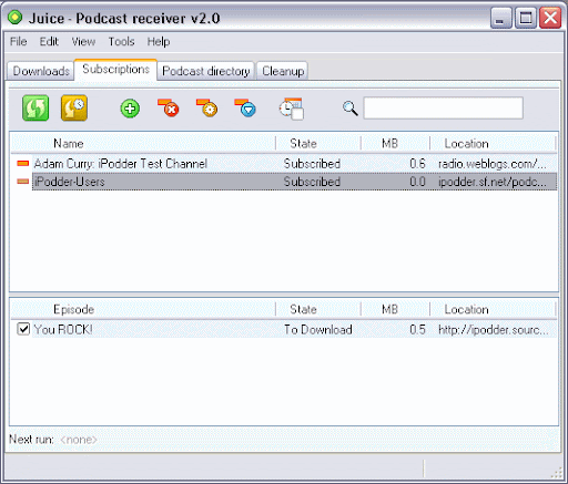 Juice é um excelente programa cliente de Podcast, funcionando com o conceito de um agregador RSS. Para tal é necessário obter os endereços dos feeds dos Podcast favoritos, podendo então ser adicionados no directório.