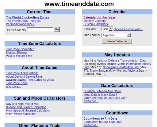 Neste sentido, o sítio Time and Date, tem uma palavra a dizer. Desde logo por fornecer calendários de qualquer ano, podendo ser personalizados quanto à linguagem, indicação dos respectivos feriados, fases da lua e número de semanas. Ainda quanto ao calendário, estão disponíveis diversas outras funções de personalização.