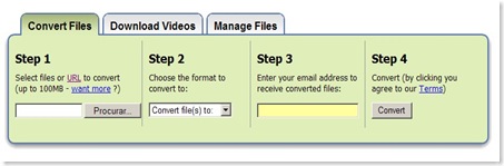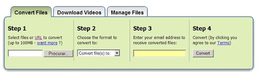 O processo é muito simples, iniciando com a escolha do ficheiro base, depois o formato de saída, a indicação de um endereço válido de email, para onde será enviado o ficheiro convertido e, finalmente, dar ordem de conversão.