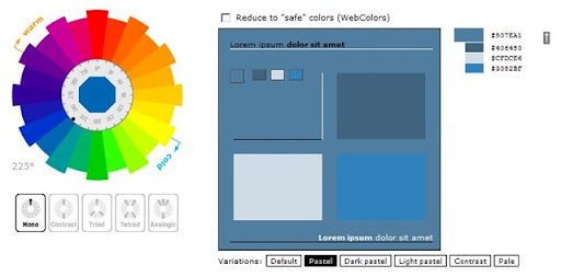 A partir de um círculo de cores base (quentes e frias), são disponibilizados vários esquemas e, a partir dos mesmos, as suas variantes em tons pastel (claros, médios e escurtos), com contraste e tons pálidos.